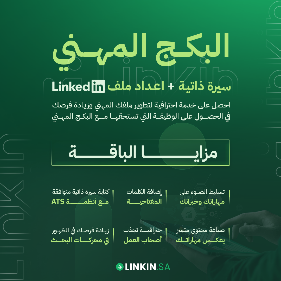احصل على خدمة احترافية لتطوير ملفك المهني وزيادة فرصك في الحصول على الوظيفة التي تستحقها مع البكج المهني. نقدم لك: