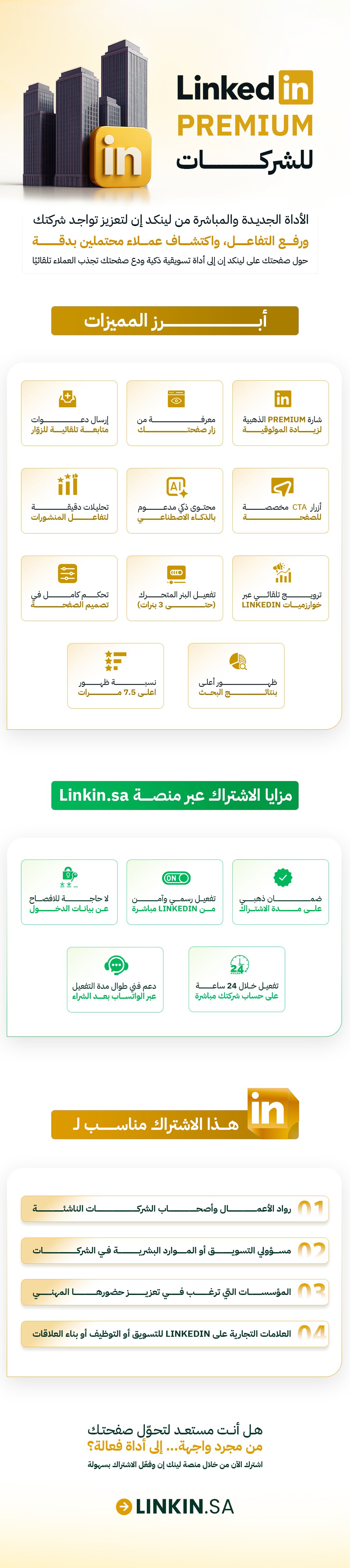 📦 اطلب الآن من Linkin.sa وابدأ بتطوير صفحة شركتك، جذب جمهور نوعي، ومضاعفة تأثيرك في سوق الأعمال.